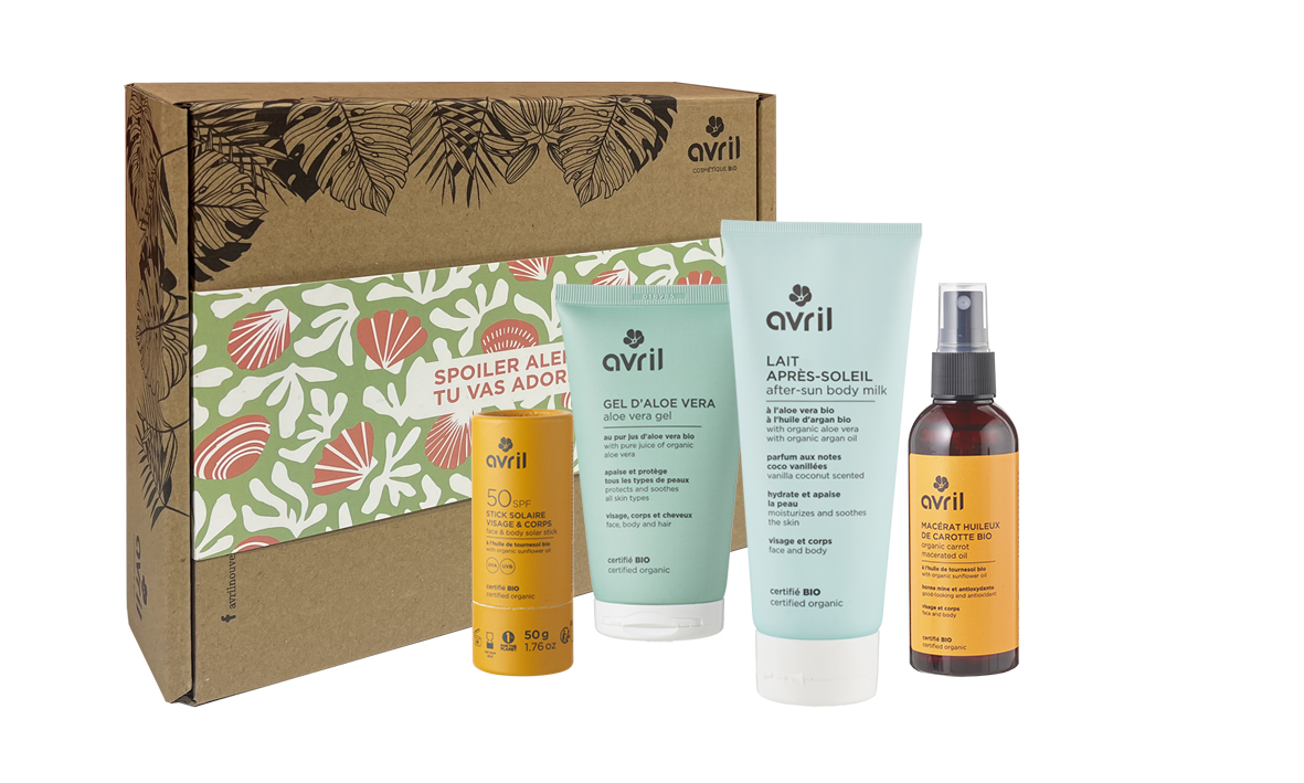 Composé d'un stick solaire SPF50, d'un lait après soleil, d'un gel d'aloe vera, d'un macérat de carotte