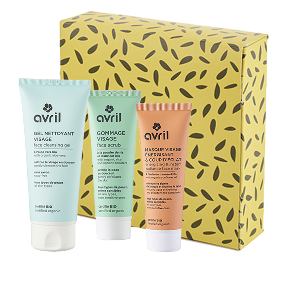 Ce coffret cadeau Trio visage est composé d'un gommage visage, d'un masque énergisant, d'un gel nettoyant visage et d'un petit coffret cadeau.