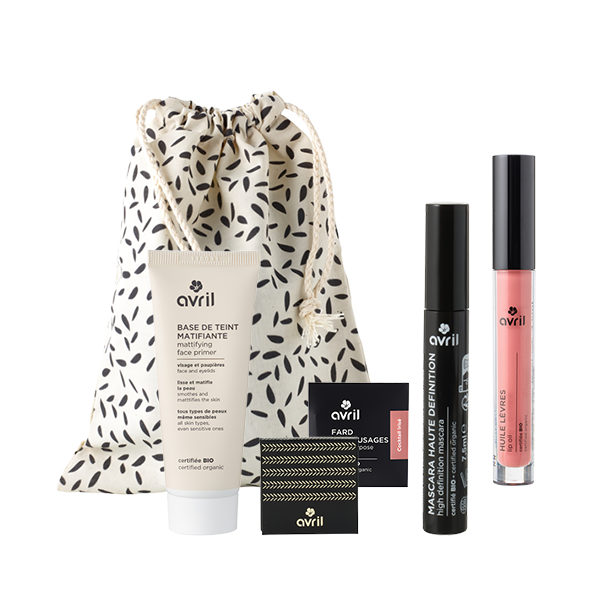 Ce coffret Mes essentiels make-up est composé d'une base de teint matifiante, d'un mascara haute définition noir, d'une huile à lèvres rose caresse, d'un fard à paupière cocktail irisé, d'un petit boîtier rechargeable, le tout dans un pochon en coton bio