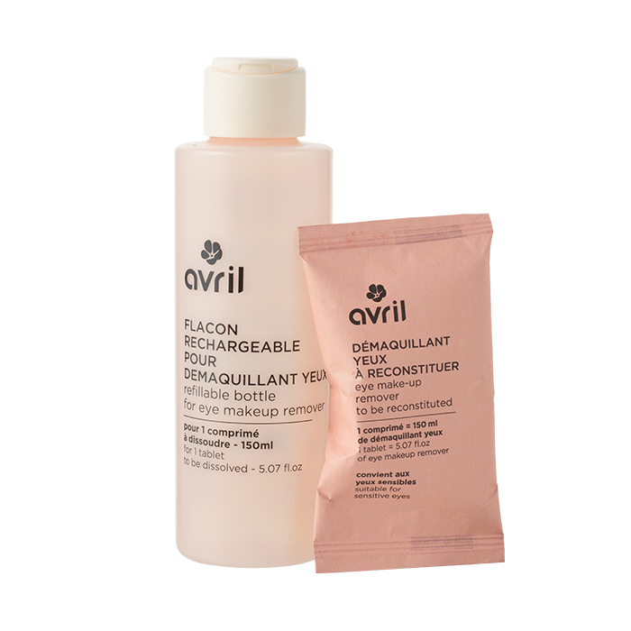 Ce produit est un kit composé du sachet de pastilles à dissoudre de démaquillant yeux et de son flacon à remplir d'eau.