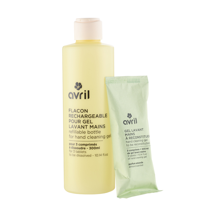 Ce produit est un kit composé du sachet de pastilles à dissoudre de gel lavant mains Amande et de son flacon à remplir d'eau.