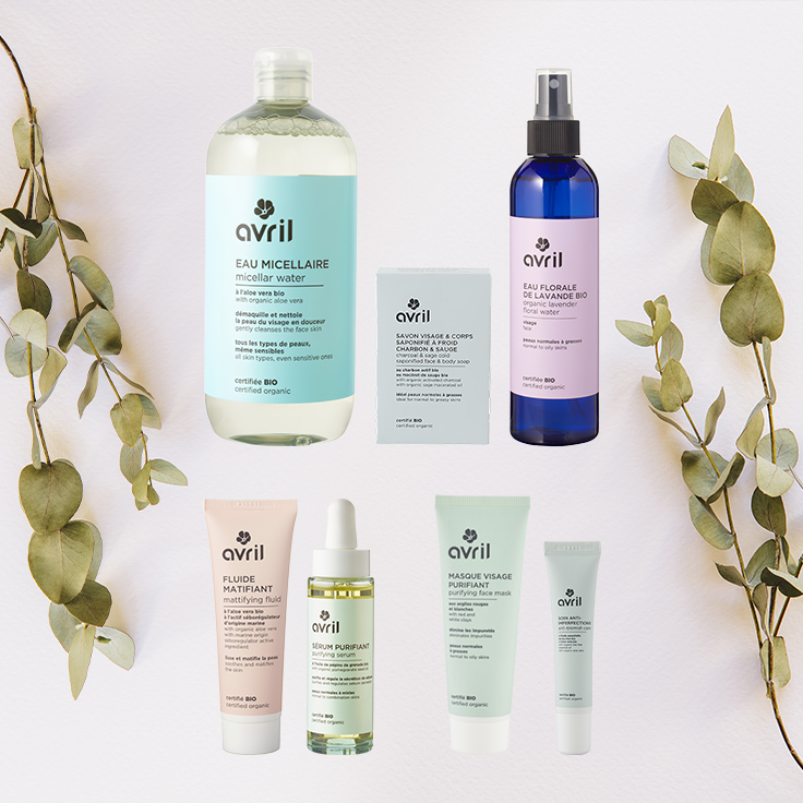 Cette routine complète contient : une eau micellaire, un savon saponifié à froid au charbon, une eau florale de lavande, un soin anti-imperfections, un fluide matifiant, un sérum purifiant et un masque purifiant.