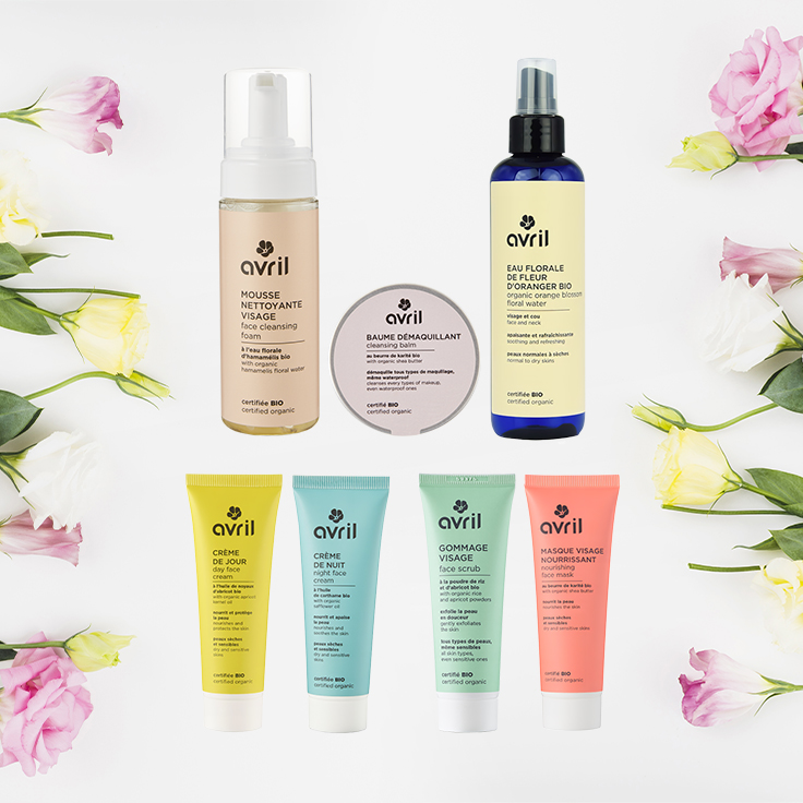 Cette routine complète contient : un baume démaquillant, une mousse nettoyante visage, une eau florale de fleur d'oranger, une crème de jour peau sèche & sensible, une crème de nuit sèche & sensible, un gommage visage et un masque nourrissant.